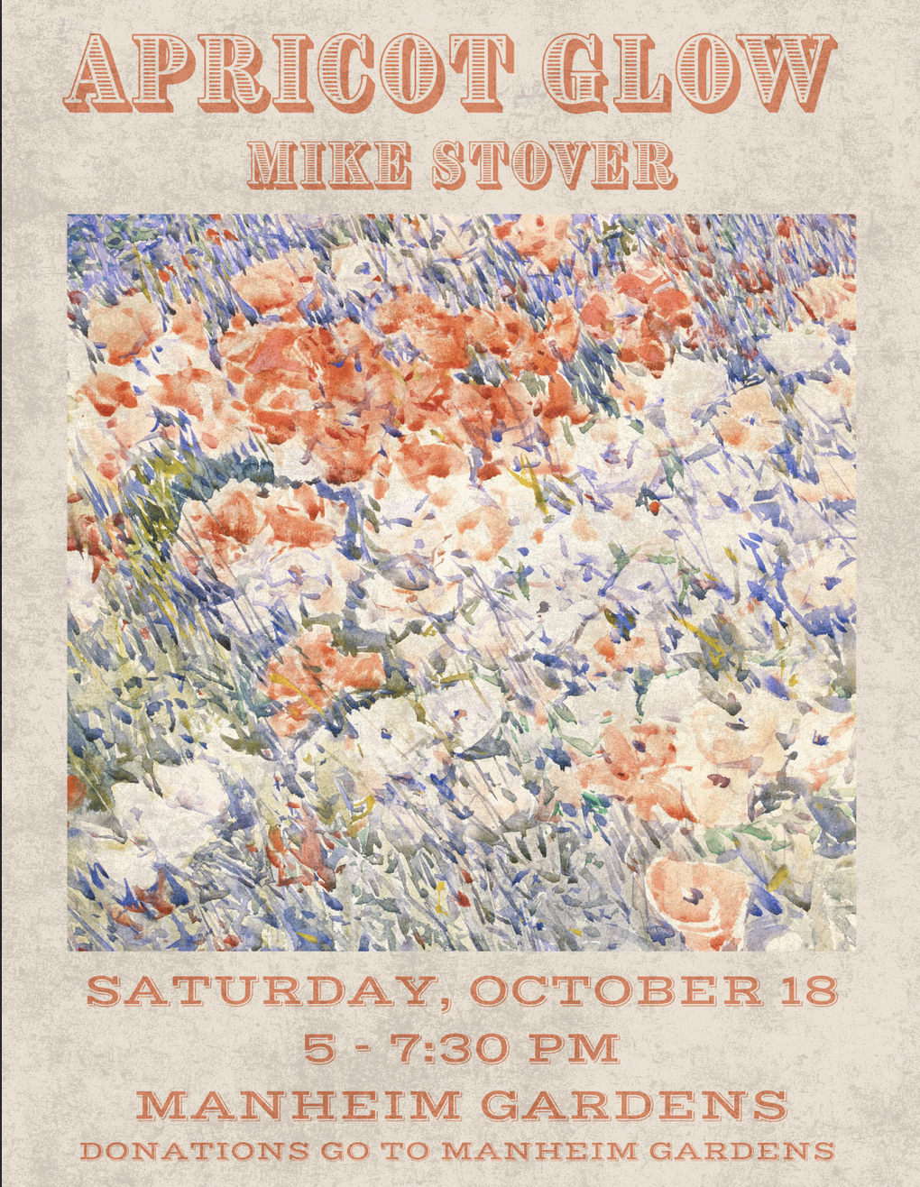 Opening solo pedal steel set from Mike Stover followed by the groove-based, Kansas City-based ensemble Apricot Glow with their unique mix of funk, punk, and jazz! All donations go to the beautiful community resource that is Manheim Gardens. Bring some food and beverages (to share ideally) and enjoy the evening!